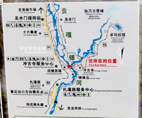 休息片刻后继续登攀,11:38终于走完钢架阶梯,视野豁然开朗,仙乃日冰峰也赫然出现在眼前。脚下有一片水面,当地人称其“人工湖”,实际上也可以明显地看出,正是有一道人工筑坝拦截了溪水,方才打造出这么一片小小的水面。路标显示:此处距离冲古寺700米,距离我们今日冲击“短线”的出发点“活佛灵塔”950米。