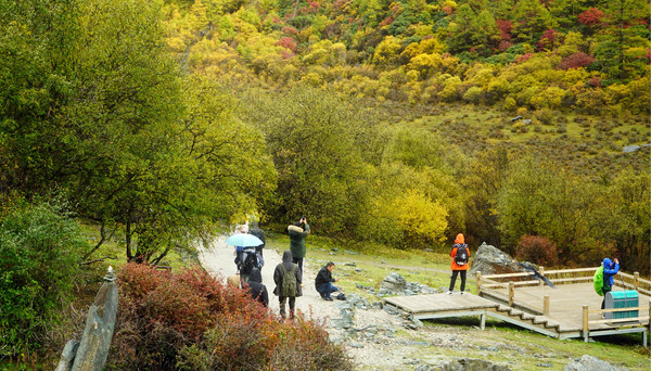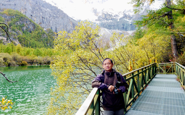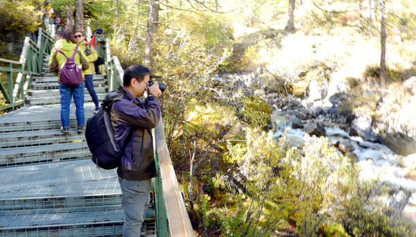 继续前行,山路开始有了较大的坡度,年轻人的耐力比我强,X.J.总是走在前面。大约是走了总共2公里多点儿的时候,见到前方一男一女两位藏民牵着两匹空马下来,有人询问从此处骑马上山要多少钱,回答200元,闻者嫌贵,因为全程骑马也就是3.5公里,收费300元,现在已经走了2公里多还要200元,显然是要价太高。两位赶马工也很强势,谈不拢扭头就走,X.J.见状赶忙上前拦下,表示愿意出200元租一匹马给我骑。于是,13:06我骑上赶马藏女的马,她显得很害怕,一再交代不能把半途租马的事告诉别人。根据我以往的经验,偏远地区都是民风淳朴,然而,经过商业开发,受到金钱、利益的诱惑,此处的民风也已变得不再淳朴,我们本以为赶马女是要把我送到山上的正规乘马折返点,谁知,我才刚一上马,她就再三告诫,声称像是我这样的人是没有能力前往牛奶海的,前面有个人工湖,风景也不错,到那里看看就行了,不必再往上走。就这样,只是骑马走了7~8分钟,她就让我下马,收我200元。然而,我却是被她忽悠,下马时我本以为是到达了正规马帮的折返点,然而,真正折返点还在上面很远的地方。赶马女收了我三分之二的租马费用,却只是送我走了不足七分之一的路程。不过,这位藏女也没说谎,人工湖的景色确实不错,我在湖边坐等 X.J.,顺便观景、拍照,一点儿也感觉不出眼前的美景有人工打造的痕迹。没多久X.J.也走了上来,我们又支起三脚架,拍了一张两人合影。