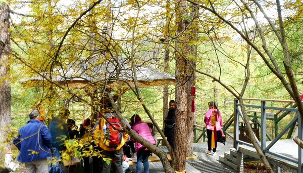 陡峭山路基本结束,前方再也没啥难走的路。11:47走到一个岔路口,向右拐距离卓玛拉措80米,向前直行距离仙乃日观景台550米,我们直行向前,绕过卓玛拉措,先去仙乃日观景台。沿途全程都是栈道,也基本上都是平路,我们先是穿越一片茂密的树林,它位于卓玛拉措的东侧,行走间透过林木缝隙可以看到右手边的卓玛拉措,湖水碧绿,秋叶金黄。走出密林就是一大片开阔地,周边都是矮小灌木丛,仙乃日雪山也完整地出现在眼前,若是想要在雪山下留影,这里就是最佳拍摄地点。12:05又遇一座路边小亭,这一次无需停留歇息,小亭过后又得攀登一段阶梯,但这个地方相距“仙乃日观景台”已经没多远了。