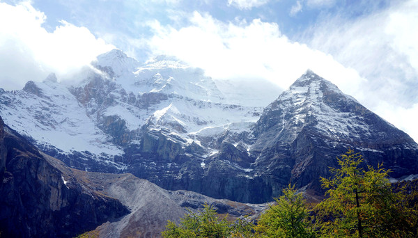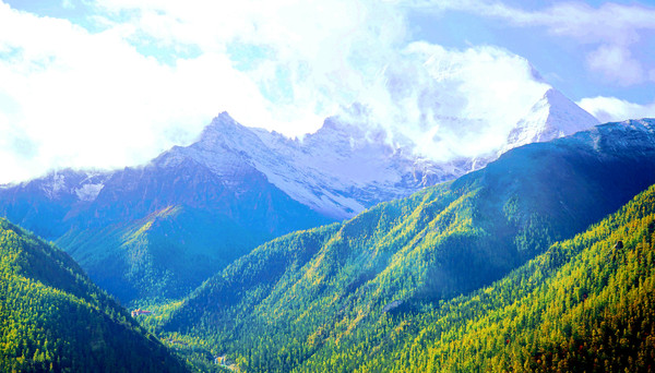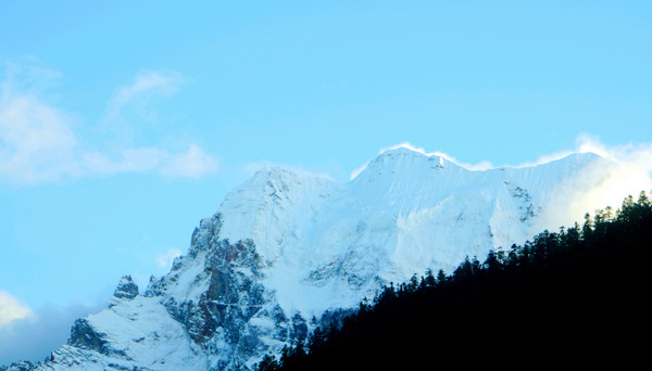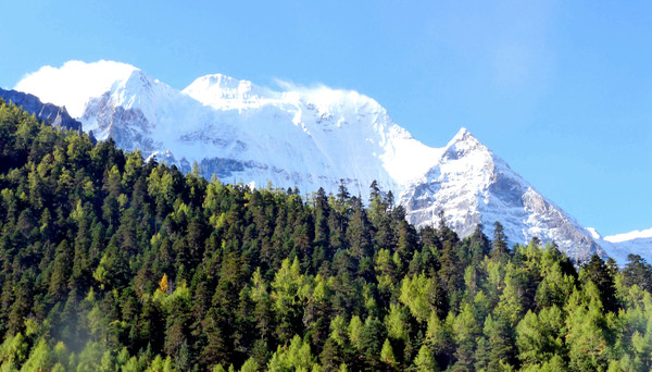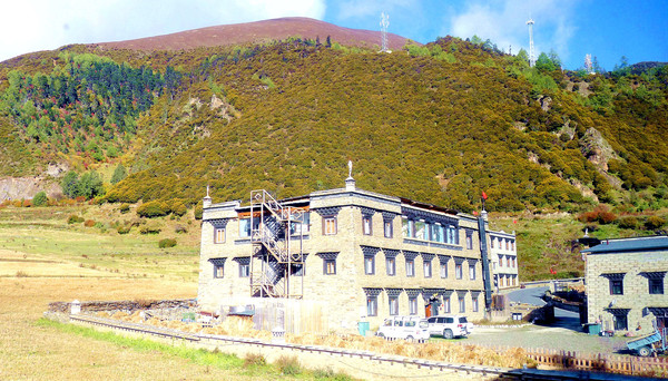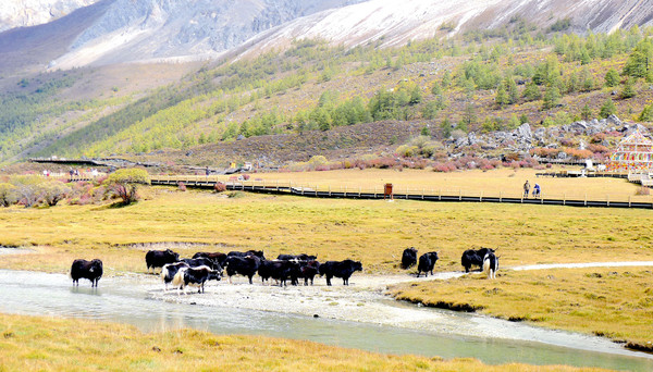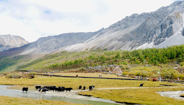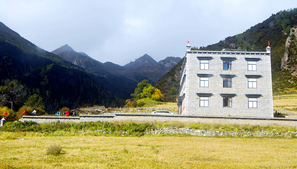 “黄金周”刚过,游人不多,交通车是一部接一部地发车,我们进入景区后很快就能上车。大约是9:00发车,40多分钟后驶抵“亚丁村”,尚在车上就看到了仙乃日雪山,它是亚丁景区三座雪峰中的最高者,顶峰海拔6032米。同车的乘客都是要去“扎灌崩”(交通车终点站),只有我们两人中途下车。亚丁村共有7处停车点,我们预定的“藏亚文化酒店”是在2号站附近,然而,我们下车后却是没看见酒店,询问村民说是往前走,但是依旧找不到。后来路遇一位藏女,我大喊“扎西德勒”,她也很热情地回应,我向她讨教,方才知道已经走过了头,酒店其实就在2号站旁边的高坡之上。我在藏区有个经验,不论是遇见什么人,只要是大呼“扎西德勒”,必定能得到热情回应。
