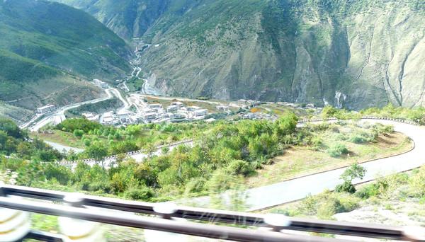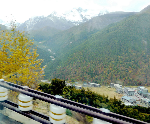 人家正在举办法事,我们不敢打搅,只在院内看看,没有进入大殿。14:53从边门走出冲古寺,又在寺外拍了一张两人合影,然后就直接前往“扎灌崩”乘车点。大约是15:40搭乘景区大巴,15:54驶经亚丁村,16:30驶抵“稻城亚丁游客中心”停车场。这条公路非常险恶,道路狭窄、弯多,全程都在大山顶上行驶,还好是坐景区大巴,若为自驾,还真是有点儿不敢开车,不过,沿途风景确实不错。