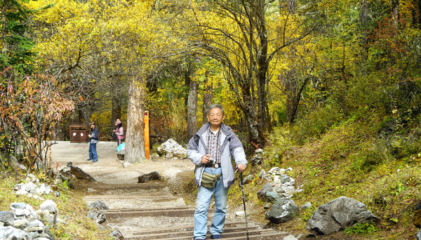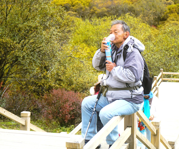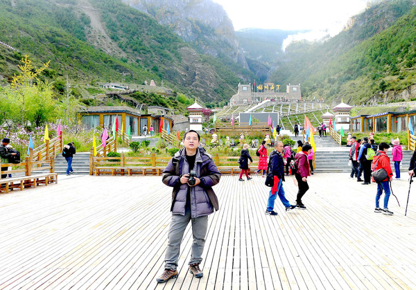 16:36重返瀑布观景台,坐下休息片刻,此处正有一对天津小情侣,随便聊了一会,他们是从牛奶海下来,瘦弱女孩没啥事,健壮的男孩却是高反严重,女孩说他男友一到牛奶海就不行了,吸了六瓶氧也不管事。跟天津人拜拜后继续下山,16:48走到山下平路木栈道的入口附近,父子两人又在“央迈勇”雪峰下合影一张,算是今日的艰辛到此结束。