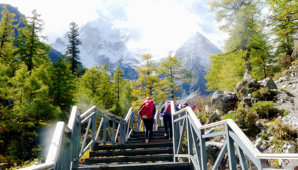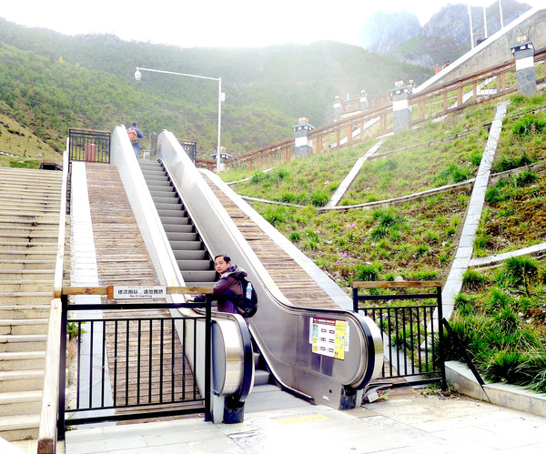 10:12又回到“活佛灵塔”旁边,右拐过桥,正式开始冲击短线之旅。昨日长线半途而废,其实从一开始我就没下决心一定要走到底,只是抱着试试看的心态。今日则不同,我对于短线还是信心满满,决心一定要走到卓玛拉措,走到仙乃日雪山观景台。10:32走到冲古寺近旁,只是在寺外坐了一会儿,跟几位藏族老妇闲聊,她们都是要到寺里去参加法会,这个地方的路牌显示,距离卓玛拉措还有850米。告别藏族老妇继续登山,再向前走不远就是长长的钢架登山楼梯,因为海拔高,登攀非常吃力,我总是控制每走40级就停下喘气,然后再继续登攀。阶梯路上有好几座小亭,我是每到一亭都必须坐下休息,X.J.走在前面,经常要停下来等我。途遇两位武警下山,鼓励我前方只剩500米,但我知道,这500米只是水平距离,关键是还得再爬高。