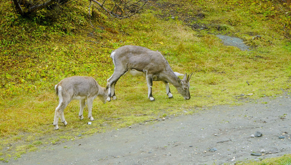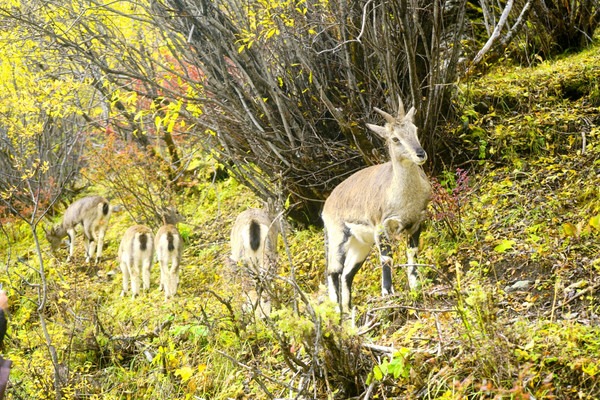 人工湖畔有一段长约130多米的水平木栈道,走完木栈道再向前行就又是山路,而且也有不小的坡度,不过,我采用走走停停的办法还是能够应付。14:16又见一群野山羊,一点都不怕人,就在山路旁边活动,可以仅隔2~3米给它们拍照,但是若想伸手触摸,它们就会警觉地跳开。野山羊们只吃纯天然食物,并不理睬游人的投喂。