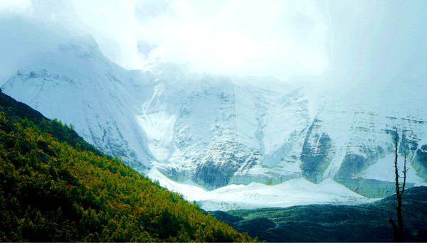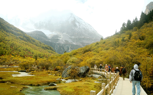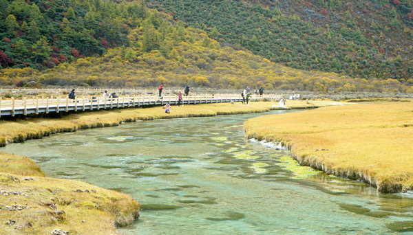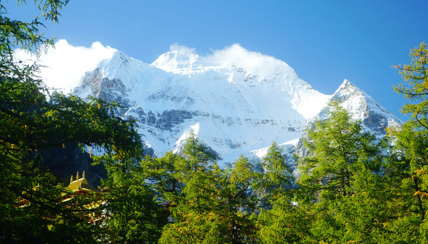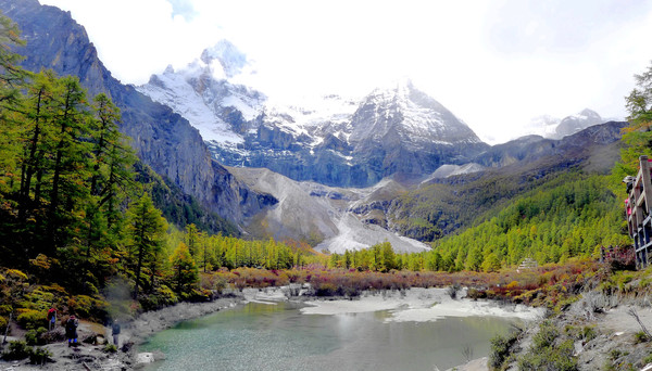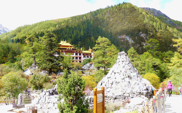 我们在“扎灌崩服务中心”下车,走上木栈道,沿着一条清澈、湍急的溪水逆流而上,沿途所见冰峰就是仙乃日雪山。11:17走到“冲古寺”脚下的“活佛灵塔”旁边,这里是亚丁景区交通枢纽,也是亚丁旅游短线与长线的分岔口:右侧岔路是“短线”,走木栈道过河前往冲古寺、卓玛拉措与仙乃日雪峰观景台 ;左侧直行为长线,沿着冲古草甸再往前走80米就是“冲古寺服务中心”,这里有电瓶车直抵“洛绒牛场”,再从牛场骑马或徒步,就可以前往牛奶海、五色湖。