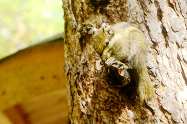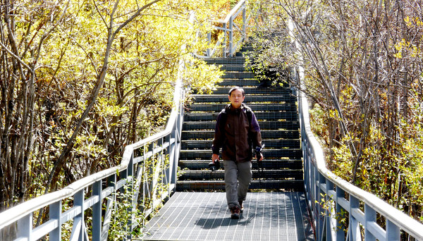 过了人工湖就是陡峭的钢架阶梯路,不过此刻是下山,与上山时的艰辛相比,下山就要容易多了。14:12又重返钢架路半途那个有亭子,有厕所的地方,休息了一会儿。此处依然是有鸟儿与松鼠向游人讨食,我刚坐下就有一只不知名的鸟儿飞到我跟前,眼巴巴地望着我,可惜我已经没有食物。