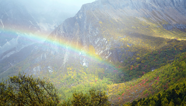返回“折返点”平台坐下休息了一会儿,高原气候就是这样作弄人,没过多久天又晴了,15:06拍张留念照后下山。与上山时的狼狈相比,走下山路是我的强项,一路观景、拍照,惹得X.J.一再提醒:走路不看景,看景不走路。天气依旧时晴时雨,好在雨都不大,甚至还看到了彩虹。我们这次最大的失误就是没有配备雨衣,虽然两人都带了雨伞,但爬山、观景、拍照,打伞都不方便。