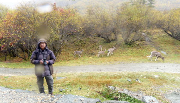 16:09重返人工湖区,两人又在水平长栈道上合影。那群野山羊也还在路边,赶忙抢拍下X.J.与羊的合影,但因为下雨,镜头上有雨点。随后又出现了一缕阳光,山间也再次有漂亮的彩虹现身,这一次可以将彩虹拍得很清晰。