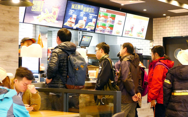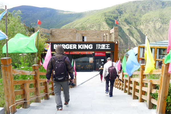 景区游客中心广场对面有家“汉堡王”快餐厅,16:42两人进入,X.J.说算是补吃午餐。牛肉汉堡、薯条、可乐套餐60元/份,X.J.喊贵,但我觉得还值,因为汉堡非常大。我曾在厦门北站吃过55元的麦当劳汉堡套餐,汉堡只有此处的1/3大小。我一份套餐吃得很饱,X.J.则是只吃了个汉堡,剩下整份的薯条被我打包带走。