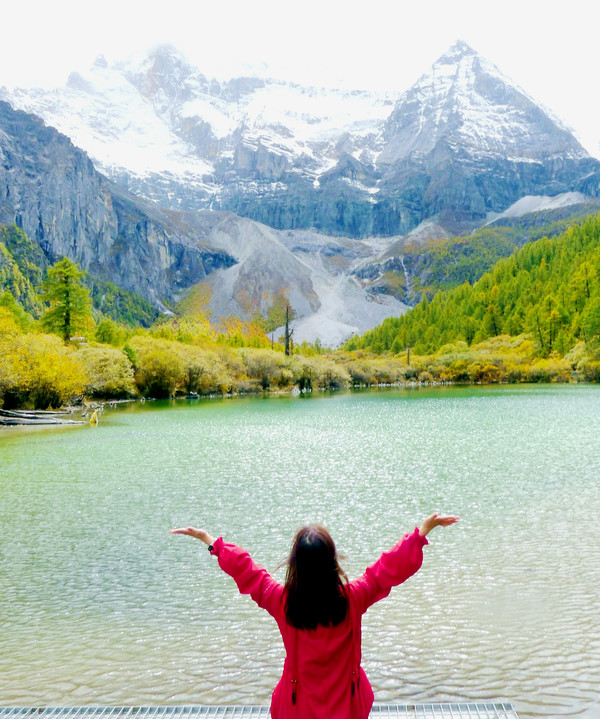 13:41走到卓玛拉措的北端,这里是卓玛拉措观景最美之处,湖畔设置观景台,湖水碧绿,雪山洁白,正好还有一位红衣女面对雪山摆拍,顺手偷拍下一张。13:54离开卓玛拉措,14:08又重返人工湖畔,与前者相比,人工湖的景色就要逊色多了。不过,两湖近在咫尺,又是相同海拔,凡能到达人工湖的游人也必定会去卓玛拉措,这不同于昨日走长线,很多到达央迈勇雪山人工湖的游人都没能“再上一层楼”,攀爬到牛奶海,我自己就是其中之一。