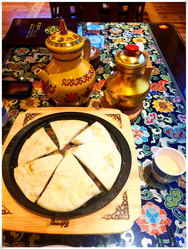 酒店的藏餐茶楼纯藏式风格,装饰自然、环境幽雅、菜品味美。“牛肉盖被”类似于我们平常吃的鱼头泡饼,有点藏汉结合的味道。牦牛肉滋味浓厚,不干、不柴;薄饼吸足汤汁,面香中夹着肉香,相当的好吃。在一个冷雨阵阵、寒风习习的高原之夜,围着火炉、喝着酥油茶、品着美食,如此温暖、浪漫的晚餐,让我至今难以忘怀。