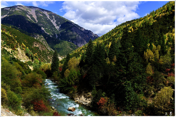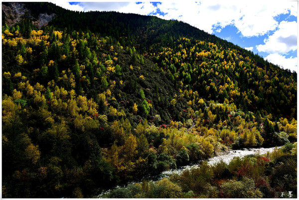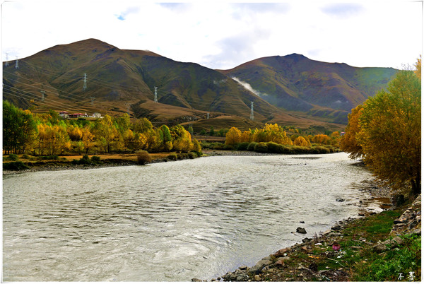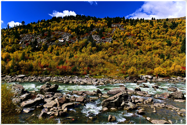 力丘河又名力曲,雅砻江的一条支流。河中水流清透,各种造型的石头散落河床,姿态万千。山坡上树木黄中带绿,偶有点点红色点缀其间。