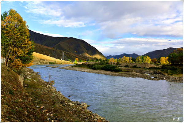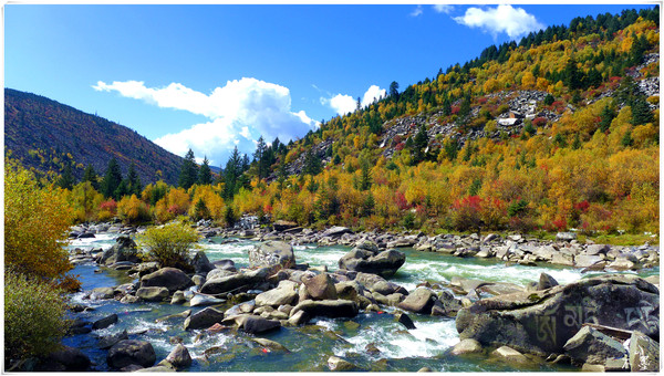渐渐地,两岸的山势越来越平缓,山间如同染了色,河边的石头也泛起红晕,俨然一幅河谷初秋