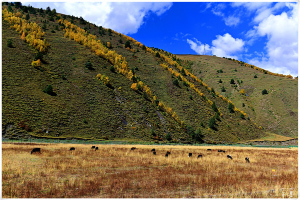 树叶金黄,秋意渐浓。小村散落在谷底,静谧安逸。牛羊漫步山坡,享受秋日暖阳。