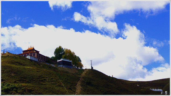 Day6(2019,9,29):8.50——10.10,瞻佛台、大金塔。10.25——11.27,桑科湿地、桑科草原(2114公里)。11.32,往合作方向,碌曲县、代尔宗大桥、分水岭观景台、尕海湖、财宝山观景台,14.46,进入四川省界,14.58,到达郎木寺镇,入住碌曲秘境郎木客栈(2301公里)。