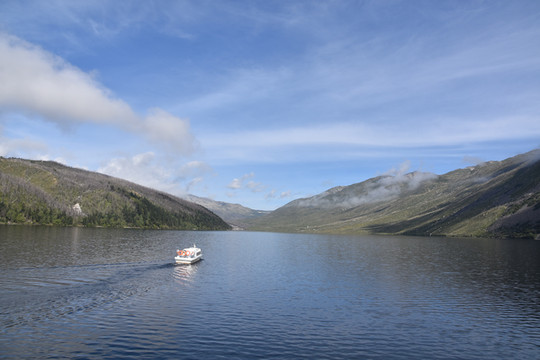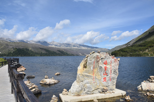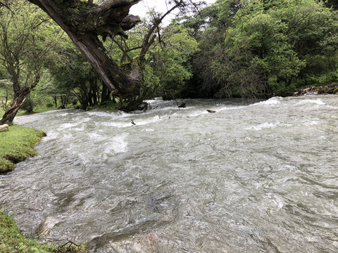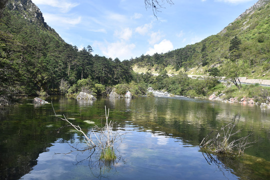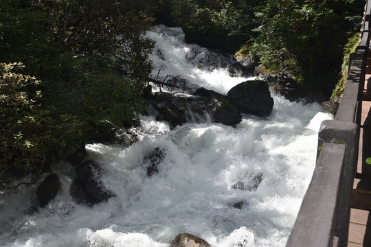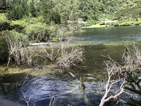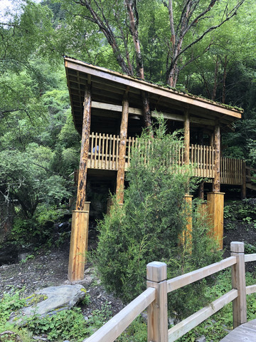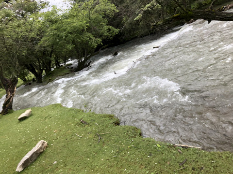 从售票处坐景区观光车直达山顶的木格措(野人海),需要约30分钟。车上听导游讲解扎西和卓玛的凄美爱情故事。木格措是川西北最大的高山湖泊,海拔3780米。坐车到达山顶的湖边,拍照和欣赏湖光山色,还可以坐游船游湖,然后顺着步道走下来,途中经过静心池、杜鹃峡,药池沸泉,瀑布群、七色海,三叠泉、迎客石,松萝观赏区等都是极好的景点。由于落差很大,水流急泻而下,万马奔腾。沿途走下来步道两边很多的野生菌,我们不是本地人不敢摘,不过很多都是在餐馆门前可以看到过的。从山顶湖边走到七色海,大概是8公里,需要约3小时。药池沸泉可以泡脚,由于时间关系我们没有停留,直接走到七色海餐厅吃中午饭,吃完中午饭坐景区观光车回到山脚。然后驱车到雅安。