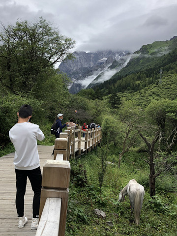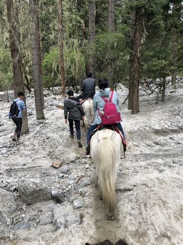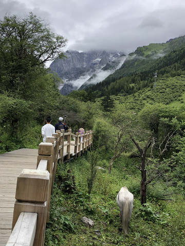 在酒店吃完早餐,步行到长坪沟的售票处,网上订票不需要取票,直接刷身份证坐景区的观光车进入景区。售票处到景区约8公里,坐景区观光车进入景区,下车后是约8公里长的栈道。栈道的尽头是土路,比较难走,一般游客不会继续前行,可以选择骑马往四姑娘山的山脚走,费用比较高。一些徒步或者登山的驴友会继续前进,同时他们需要另外购买登山票并登记。在栈道尽头需要原路返回,当然也可以考虑骑马回来,骑马需要另外收费,费用约150元/人。