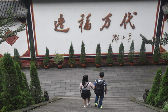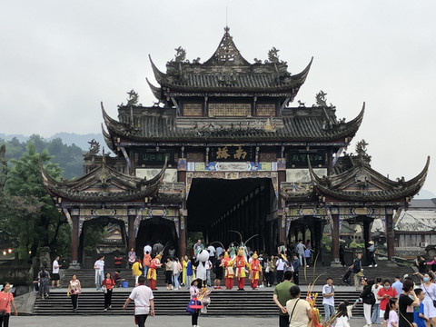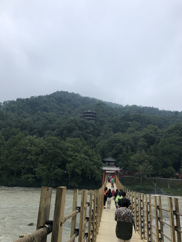 游览都江堰景区,最好是从山上的秦堰楼进入,然后步行下山,经过二王庙,索桥、鱼嘴,宝瓶口、飞沙堰等最值得去的景点,最后从离堆公园出来就是古城,经过古城可步行回酒店。秦堰楼入口人少,步行下山轻松。都江堰水利工程,由蜀郡太守李冰父子组织修建,建于公元前256年,两千多年来一直发挥着防洪灌溉的作用,滋养着成都平原。这个工程蕴藏着古代劳动人民的智慧,因地制宜,采用分流而不是筑堤修坝的治水方法。他们充分利了平原广阔的优势,利用修建鱼嘴进行第一次分流,分内江和外江;在玉垒山处进行凿石开山(宝瓶口)将外江水进行第二次分流,从而很好的将水引入广阔的成都平原,既避免了水量过度集中带来的洪涝灾害又将水分流到不同的地方进行灌溉,一举两得。我们吃完午饭,打滴滴去都江堰景区,从酒店到景区的秦堰楼入口,车费6元。前一天在网上订好票,直接刷身份证入园。秦堰楼是景区的最高处,这里可以俯瞰整个水利工程,视野开阔。从秦堰楼往下走就是二王庙,这是千年古庙。穿过二王庙就来到山脚的江边了,走过索桥到达鱼嘴。从鱼嘴到宝瓶口约1公里,如果不想步行,可以坐观光车。在宝瓶口处还可以观赏飞沙堰的景色。在宝瓶口处经过外江索桥,就到达离堆公园。从公园出来是古城,店铺林立,古色古香。这里餐馆也很多,我们出来时已经时下午五点多,找了一间吃帽菜的馆子,吃了顿丰盛的晚餐。从餐馆出来,没有走几步就到了下榻的酒店。