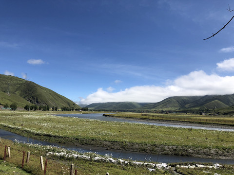 第二天沿国道248原路返回,经塔公草原。八美至塔公沿途是高原上的草原,这里水量充沛,溪流潺潺,牛羊成群。前一天晚上由于天黑,无法领略这里的景色。早上太阳升起,雾气逐渐散去,路两边的优美景色一一呈现,我们放慢车速,欣赏沿途美景。停车登上塔公草原的小山顶,草原的优美景色尽收眼底,远处的亚拉雪山也露出真面目。