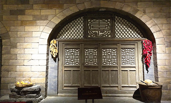 朱漆格扇雕花大门,青瓦双坡屋项,门额上方堆绘图案装饰。大门框上额乾字,两侧书元亨、利贞,南、北厢房门口分别额福、禄二字。