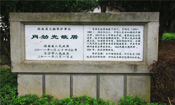 肖劲光故居位于湖南省长沙市赵洲港29号,在岳麓山前,为一坐西向东的清末民居,房舍占地面积约350平方米,泥土夯筑墙,正面三间,进深二间,并有两厢房。