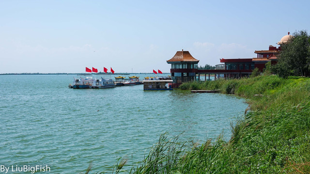 南海北有青山朦胧辉映,南有黄河玉带环绕,湖中碧波荡漾,湖滨水草丰美,天空鸥鸟翱翔,风景独秀。