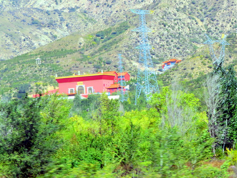 不知是谁叫了一声,“快看,半山上有个白色的塔。”果见山上有个白色的小塔,山下有好大一个寺庙,车行中很快闪过。听导游介绍,这是美岱召(蒙古语“美岱”意为弥勒,召就是寺庙的意思)原名灵觉寺,后改寿灵寺。是内蒙古地区重要藏传佛教建筑之一,全国重点文物保护单位,在京藏高速公路的北侧,东距包头市约50公里的土默特右旗美岱召村。美岱召依山傍水,在建筑上更有独特的风格。它是仿中原汉式,融合蒙藏风格而建,是一座“城寺结合,人佛共居”的喇嘛庙。总面积约4000平方米,寺内有大量的壁画,如大雄宝殿内释迦牟尼历史壁画及描绘蒙古贵族拜佛的场面的壁画都完好无损。只可惜我们行程中没有这个景点,只好留下遗憾了。