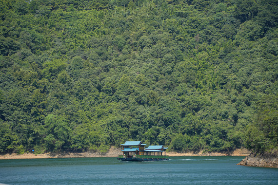 乘坐在画舫船上,可以尽情欣赏五泄美景,两岸的元宝峰、鹫鹰峰、仙桃峰、杜鹃峰、老僧峰、仙掌峰的倒影弯折,偶尔有水鸟在水面低飞,大有“青山绿水景无尽”之感,又有“一折青山一扇屏,一弯绿水一古琴”的诗意,美不胜收。