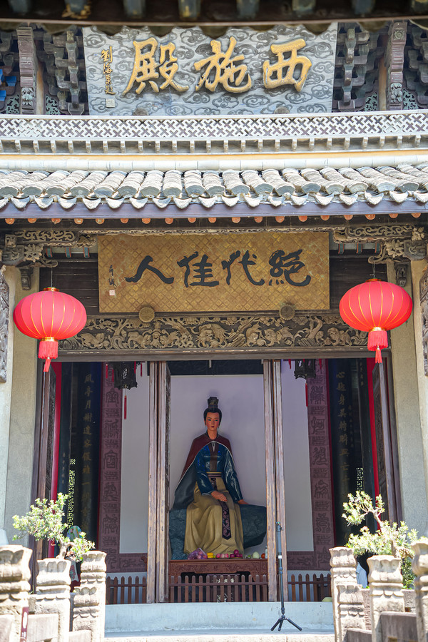 古色古香的西施殿坐落在苎箩山麓,浣纱江畔。殿内供奉有西施塑像,周围有红粉池、郑旦纪念亭、先贤阁等景点。