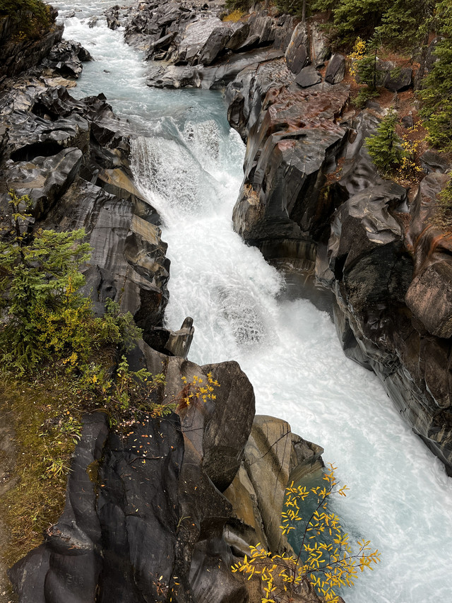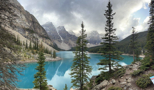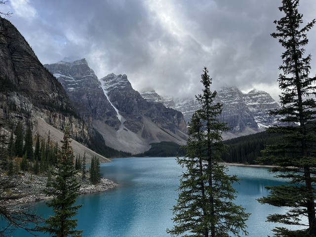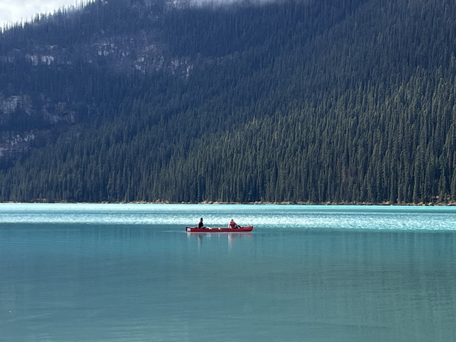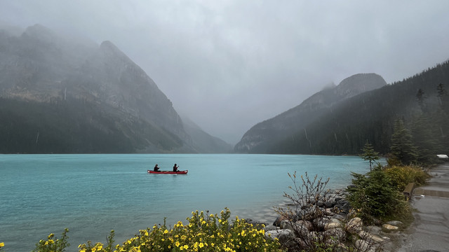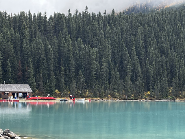班夫国家公园是加拿大最大的公家公园,最有名湖是路易斯湖,可惜当天气温很低而且开始下雨有时还飘着雪花,太冷没能实现在路易斯湖划船的愿望,只好沿着湖步行了一段,虽然阴天但路易斯湖仍然呈现出翠蓝色,像一块翠蓝色玻璃映衬着山水间;临湖而建的费尔蒙城堡酒店是班夫国家公园最高档的酒店了,游客特别多,在这里吃饭要预约,买咖啡上卫生间都要排队