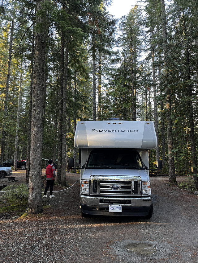 营地推荐指数三颗星:Whistler RV Park and Campground在一处森林里,仅提供停车位,无水电排污供应,无网络,有公共卫生间及淋浴房;80加币;第二天可以开到有加水排污的车位对房车进行处理,方便后续的行程;