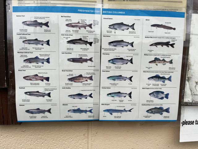 在房车营地的服务中心的门口墙上有张贴鲑鱼种类及分布示意图,说明我们找的地方是对的,我想是因为还没到鲑鱼洄游的旺季;