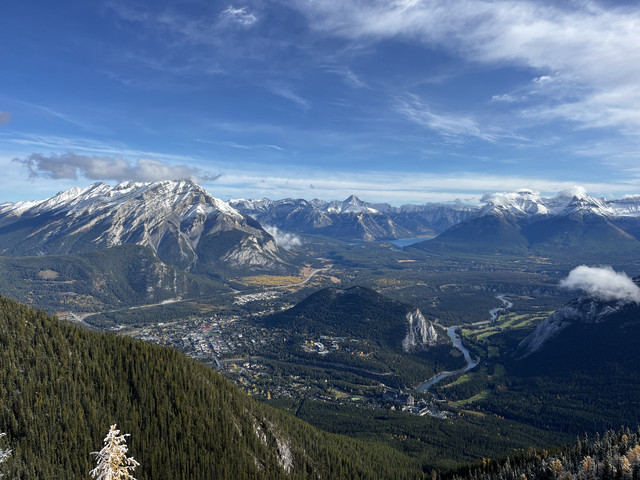 山上昨晚下雪了,地面有积雪,小心地滑,登山的游客一定要换上防滑鞋;缆车到达停靠点还要步行半小时才能到达山顶,从山顶看山脚下班夫小镇,一条河流环绕着小镇,画面右前方雪山下深蓝色的湖就是双杰克湖(Two Jack Lake)和明尼旺卡湖(Lake Minnewanka),金色的树木点缀着小镇,真是一副美丽的画面