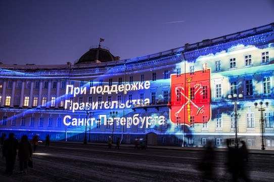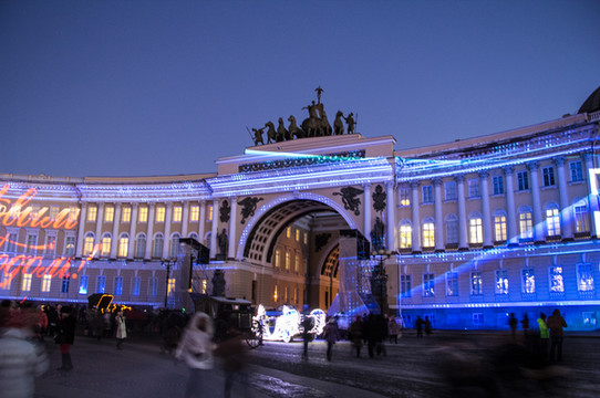 往回走了。这个 亚历山大 柱广场上(冬宫外广场)投影直接打在建筑物墙上,非常华丽壮观。