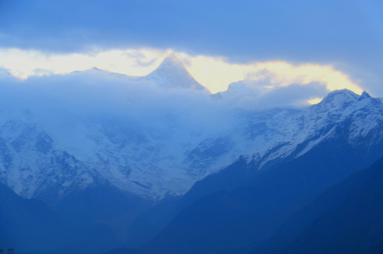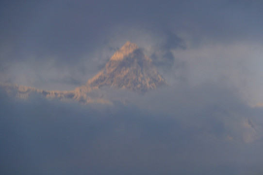 晚上和第二天清晨,我们有幸看到了一点点的南迦巴瓦峰日照金山美景。尽管云层仍然较厚,能见度不是很高,景像也不是很清晰,而且仅有短短的几秒钟,但已是实属不易、令人振奋了。