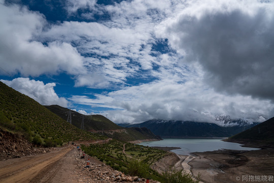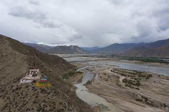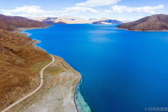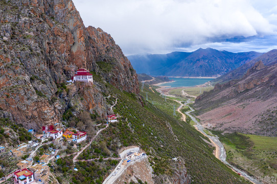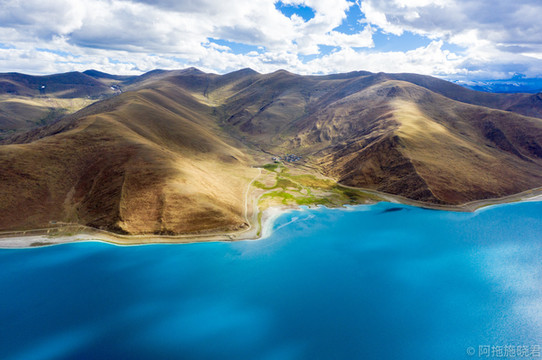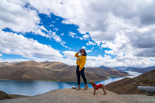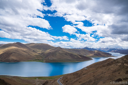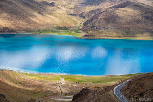羊湖最美的还是日托寺那一片。正常我们看到那条蓝色丝带是翻越岗 巴拉 山口可以拍到的,还没到垭口的地方还能遇到常年待在那里的藏獒,可以合个影。