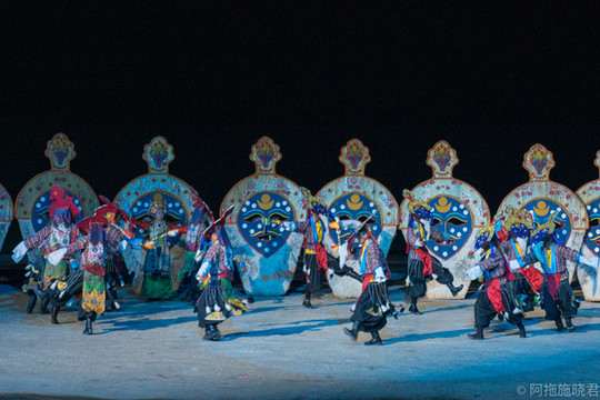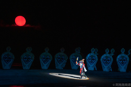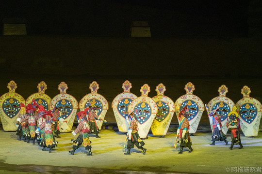 这是一场以山川为景,一抬头还能看得到星空的室外演出场景,讲述着 文成 公主与松赞干布和亲的故事。我会来看 文成 公主,更多的不是因为它的故事情节,超爱藏族人民的舞蹈戏曲。在实景剧里,既可以看到腰鼓舞、打阿嘎、牛皮船舞和藏戏。