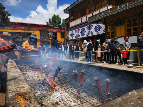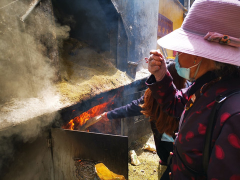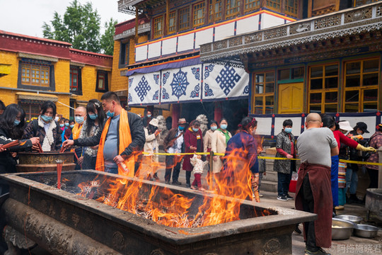 在寺庙门口买上一些艾草松叶,扔进煨桑台里,看着熊熊烈火点燃了它们,仿佛也带着我的心也随着风自由而去。我比较习惯一路排队,一直到大殿门口才直接买白酒和哈达,还有更多的人会带上酥油和小勺,不仅是供酒也要添灯。