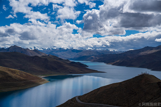 我们从峻巴渔村出来以后,时间还早,也就是下午一两点钟,回 拉萨 太早了。不如就近去趟羊湖,也算是闲着。这一次看到的依然还是那条蓝丝带,在网络上随便一搜羊卓雍错一定会跳出来的那个角度。