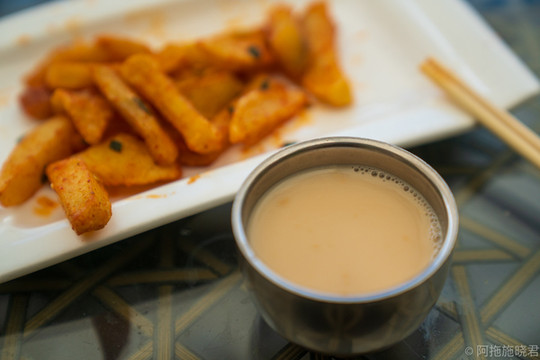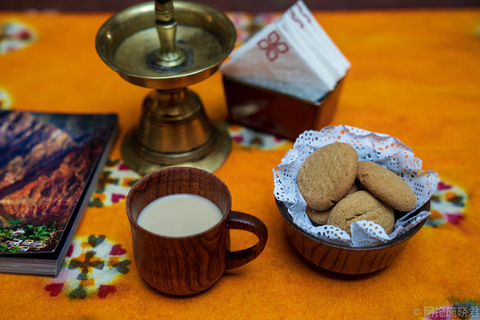 我最喜欢的是尼桑辰波商场的楼上,入口不是很好找,它距离大昭寺金顶很近,宏伟的布达拉宫也就在眼前。甜茶喝腻了有时候也会点上一壶清茶,就是用砖茶加上盐泡出来的茶,是咸的。