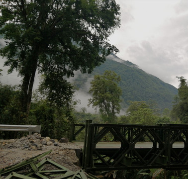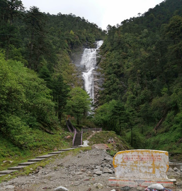 墨脱作为中国最后一个通公路的县,这唯一与外界联系的公路路况不太好,总有塌方,只能单行,单日进双日出。听说正在修建一条从林芝进来的西线公路。早上出发时云雾蒙蒙,一路上时雨时停。在这里我们用了当地的车和司机,司机是个高大帅气腼腆的小伙子叫向巴多吉,总是很平和的表情,没见他着过急,不太爱说话,问一句答一句,有时要问两三句才能答一句。他一路听着流行歌曲,不少是粤语的。走了一段路看到一个细高的瀑布,下面石头上刻着:雅鲁藏布大峡谷国家级自然保护区,再走一段来到嘎隆拉隧道,多吉说以前没有隧道要盘山的,只要下雪就进不去出不来了。过了隧道就一路向下,道路两边逐渐变为热带植物,空气也越发潮湿,恍惚到了海南,多吉说这里太热了,他每次来都热得受不了,巴不得赶紧逃走。有几处塌方断了路,只能从乱石上或水坑里开过去,旁边的桥正在修,不久的将来就可以从桥上过了。