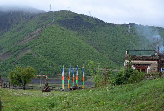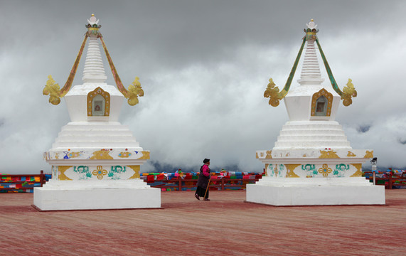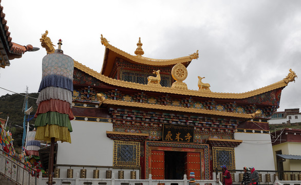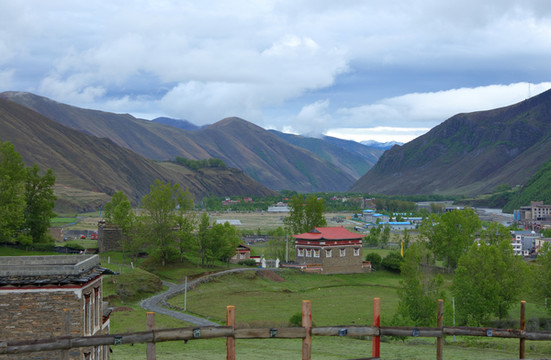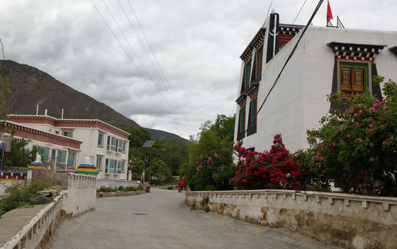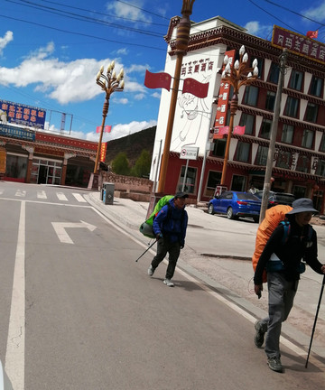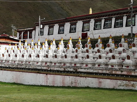 傍晚到居里寺,雨下起来了。团长问大家要不要拜访,有人响应,五辆车沿着只容一辆车的窄路鱼贯而入,如果对面来车就要有一方后退到比较宽的地方让行。寺里除了我们没有别的游客,冒着冷雨进到僧人们的住处,里面生着炉子很温暖,每人请了酥油灯和哈达到主殿去拜,看介绍说这里有几百年的壁画和上千年的经书,对于我这种“教盲”来说看不出什么名堂,跟着走过场。团里王大姐很虔诚,认认真真地拜过。从大殿出来雨居然停了,天空中央还透出了一点蓝,大家都说是王大姐的诚心打动了老天爷。回到318国道继续前行,路两旁正在建设各种大酒店或摄影基地,基本是十几二十间房的两三层的藏族风格的筒子楼。