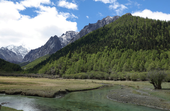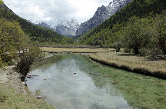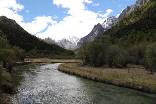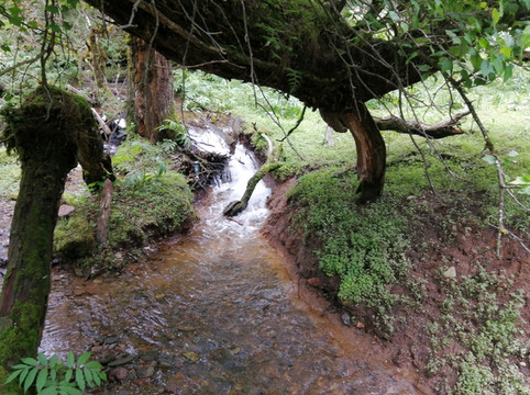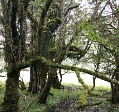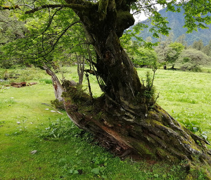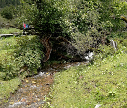 中午开进林芝市区,入住博泰林芝大酒店。下午晴空万里,我们来到南伊沟——一个我从没听说过的地方。据说这里雪山碧水绿树鲜花,一样都不少。走了一段机场高速转上普通公路再到乡间小路最后停下来,在车里看到团长和陪同说了半天,最后通知大家“我们就不进去了”,一头雾水,正好路旁有一大片草地,嫩绿欲滴,陪同建议我们沿着栈道走一圈。一条清浅的小溪弯弯曲曲不知从哪里来到哪里去,奇形怪状的树零零落落地散布着,从来没见过的花在道边悄悄地绽放着或凋零着,这片不知名的草地给我们带来放松和享受。