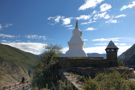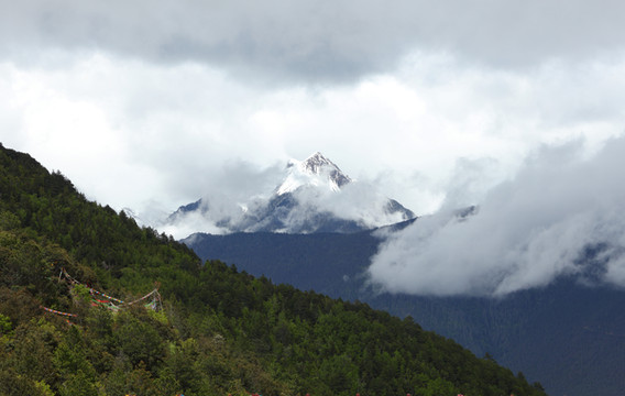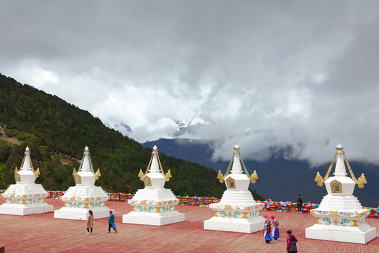 天气不好,团长决定上午晚些出发去飞来寺,飞来寺前的平台可以俯瞰德钦县城,远眺梅里雪山,但都看不见。向前走到一个位置更好的大平台,停好车正在拍照,有人过来要收费,还要登记身份证,好像一人20元。尽管云雾缭绕卡瓦博格无影无踪,近处的雪山还是能看见的,大家一通各种组合各种姿势拍照。我的摄影包拉链没拉好,镜头罩掉下去了。儿子下去在树丛中找,捡到好几个,其中一只很像,带回来洗完一试还是不对。