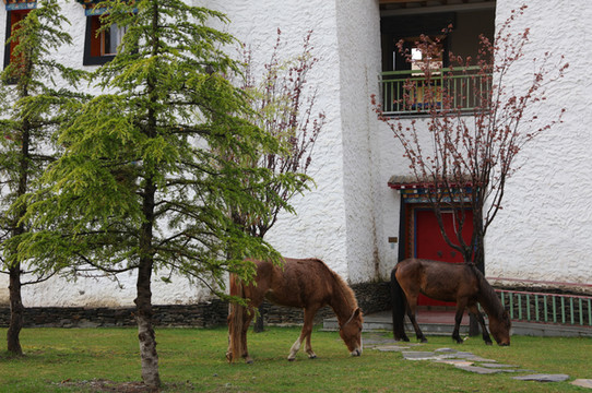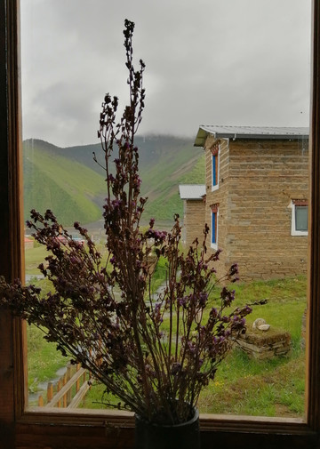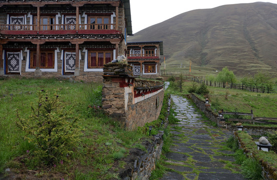 康定贡嘎宗庄园离新都桥镇中心不远,是我们的第一个落脚点。离开国道走一段上坡路就到了,纯藏式的二层小楼排列在山坡上,出门就要上下坡,对我们这些刚从成都一下来到3000多米高原的人来说很艰难,车停在下面停车场,服务员的一个重要任务就是帮客人提行李。经理尼玛帅气又认真,会因为我们用错了杯子或坐错了位置而着急,一定要按规程安排好一切,听他说酒店的老板是个留过学的藏族人,难怪酒店设施很现代化,电暖气、浴霸、马桶与地台式床和炕桌共存,菜虽是改良川菜,但是按西餐方式摆桌,吃饭按人头算,不点菜但管够,可以任意加。酒店周围风景如画,如果天气好可以看到贡嘎雪山,每个房间望出去都有美景,酒店本身也像一道风景,餐厅中央一个漂亮的大炉子上烧着热水,屋顶的烟囱升起袅袅炊烟,给大片的原野增添一丝生气和温暖。这里气温很低,屋里要开暖气,屋外要穿棉衣。