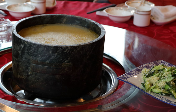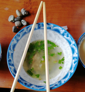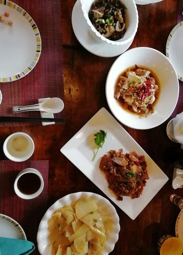 中午在一家纳西族网/红店农家乐吃午饭,他家面条有名,还搞了个噱头,如果谁能一次吃50碗面就全免单。桌上放一碗小石头,吃一碗在面前放一块石头计数,其实所谓一碗也就一筷子,女生吃六七碗没问题,卯卯劲九碗也可以,男生十二三碗不是事儿,我吃了七碗。桌子像茶几一样的高度,客人面对面坐在长条硬沙发上,每桌都摆满一桌子菜,有藏香猪做的火腿,有牦牛肉,还有各种炒菜。快吃完时老板娘特意过来献歌敬酒。