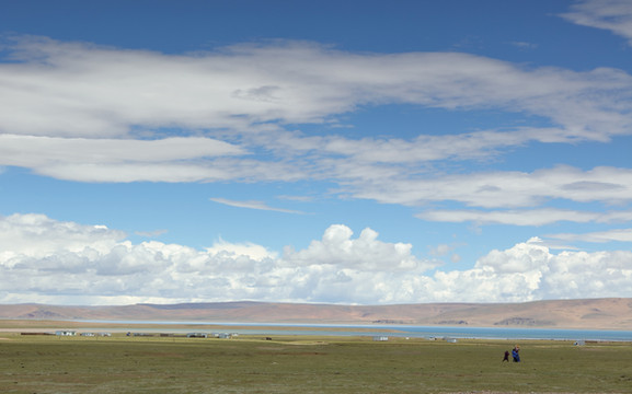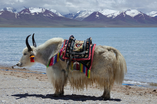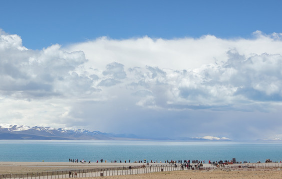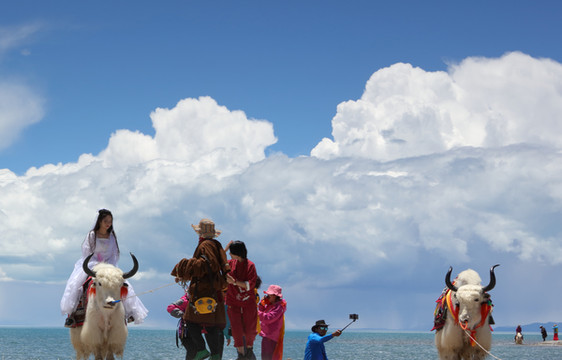 第十四天我们单车出发去纳木措。中间有一段道路被冲毁,其余都挺好走。近12点到达景区门口, 120元买了票,公厕没有水很脏,开进去到湖边还要一个多小时。纳木措好大,在不同位置看到不一样的湖景,有盲人摸象的感觉。吃过带的午饭来到主景区,就是有大石头上刻着纳木措的地方,从停车场走到湖边是个缓坡,看到很多人举着氧气瓶互相搀扶着行走,有的干脆扶着栏杆原地休息,4718的海拔不是闹着玩的。刚刚好的蓝天白云做背景,纳木措显得更加妖娆,白色的牦牛被打扮的花枝招展用来拍照,被推进水里拉上岸来不停地摆布,它会羡慕在天空和水上自由穿梭的鸟儿吗?还有那些自在地溜达着不停地吃吃吃的丑丑的黑牦牛和灰羊?漂亮有时是祸呀!在湖边逗留了一些时候,阴云上来了,我们踏上归程。