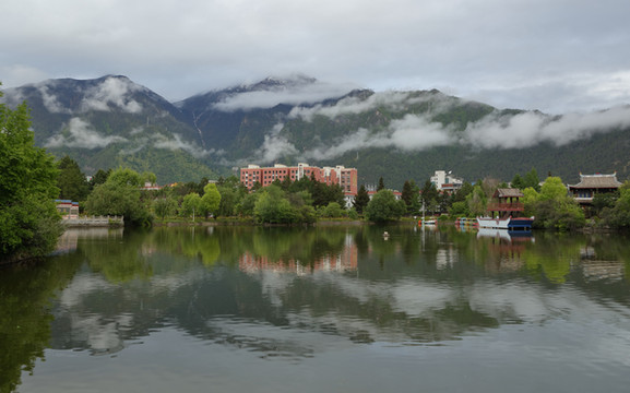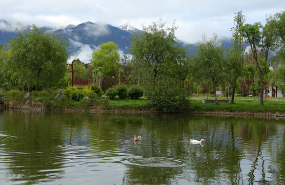 第十二天我早起独自到酒店附近的福建公园,亭台楼阁点缀在一池湖水周边,还有座石船,鸭子一家悠然自得,鸳鸯在水中玩耍,极富江南风格的小地方,唯有远处的雪山和围绕在山腰的哈达云透露了它的位置信息。