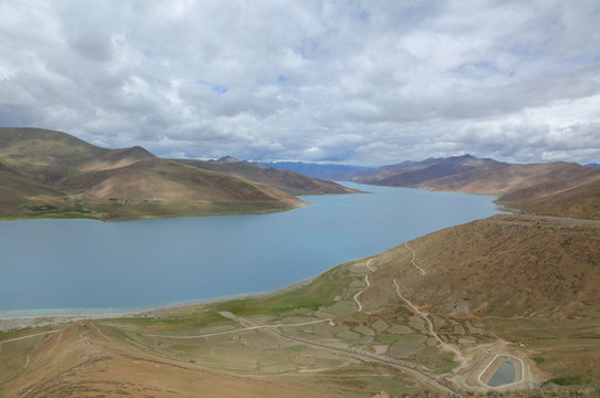 第十五天团里美女的表弟来陪她玩,我们一起去羊卓雍措。表弟从内地毕业后来山南工作,对这边很熟,有他带路省心不少。他开车一路来到山上一处平地停了车,一问之下说这段是全段限速,入口到出口的时间不能短于规定,早知这样慢慢开就是了。等待的时候看到一人在自弹自唱,不知是不是专业,水平还可以,拍照录像要付钱。凑过去聊聊,他是山东人,疫情闹得没事做,带着妻女开车出来边走边唱,车上摆着围巾披肩卖给需要的人。生活不易,但总有办法找乐儿。羊卓雍措60元,同样有牦牛拍照,还多了藏獒。藏獒温顺得像大狗,和我见到的那只完全不同。美女和大狗拍了许多合影。天阴的发暗,景色逊色不少。