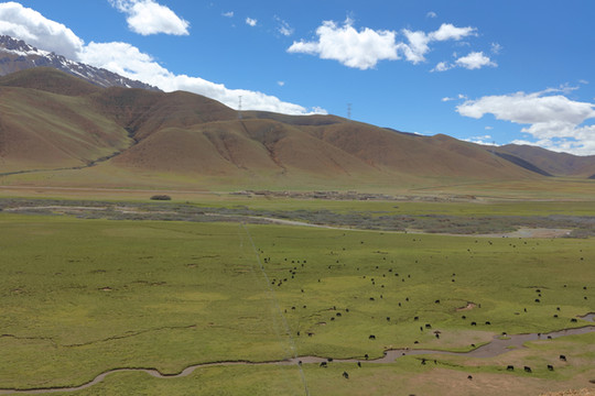 第七天比较轻松,去了一处新开发的草场,游客中心还在施工中。我们开了一段没路的路到栈道边,翻栏杆进入栈道。这里视野开阔,绿草黑牛小溪在脚下,雪山在远方,蓝天在头顶,所有颜色都那么纯粹。